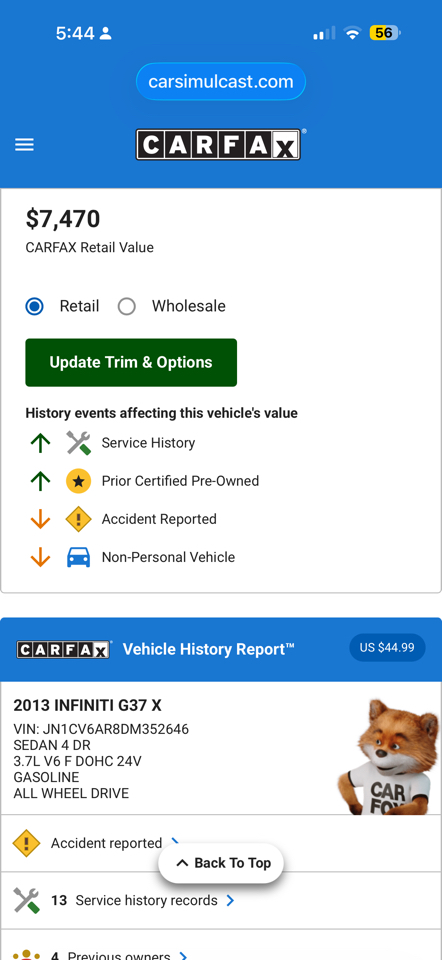 Vehicle Inquiry for 2013 Infiniti G Sedan 37x AWD